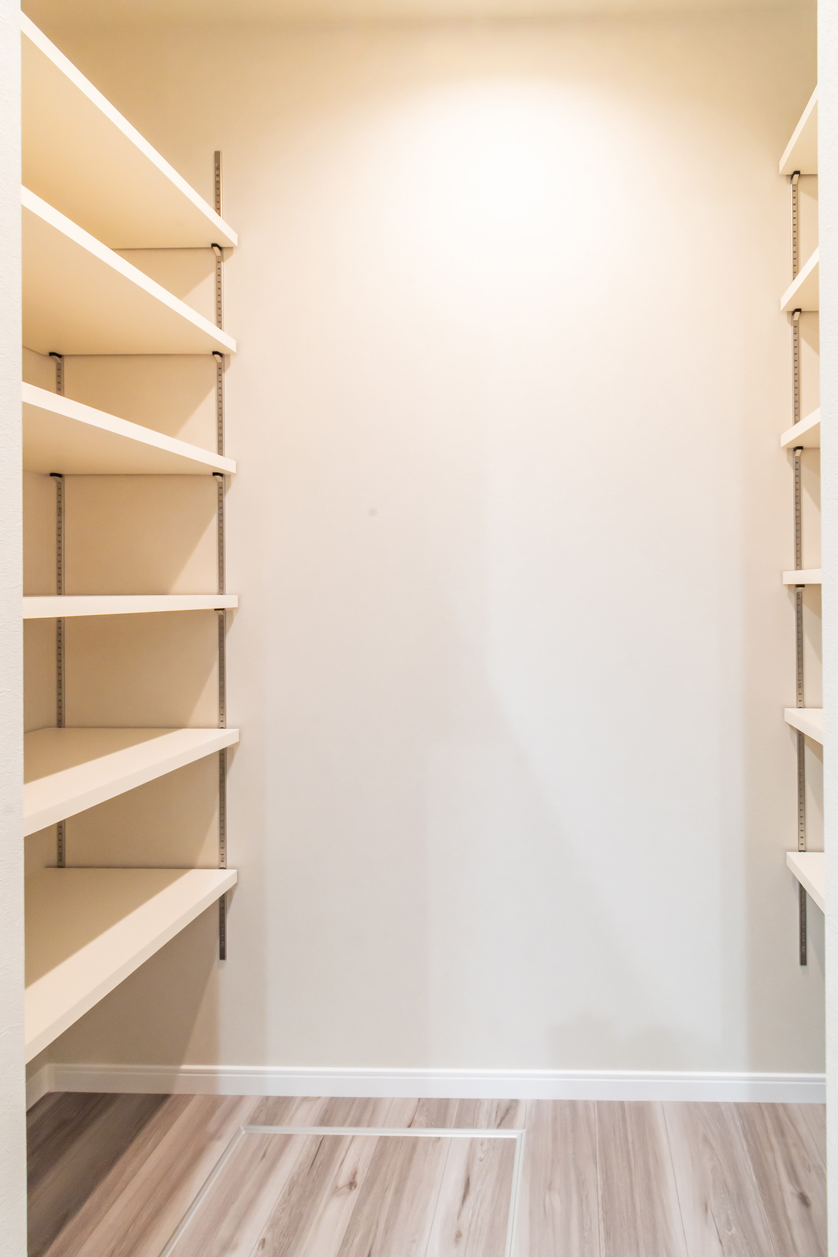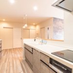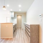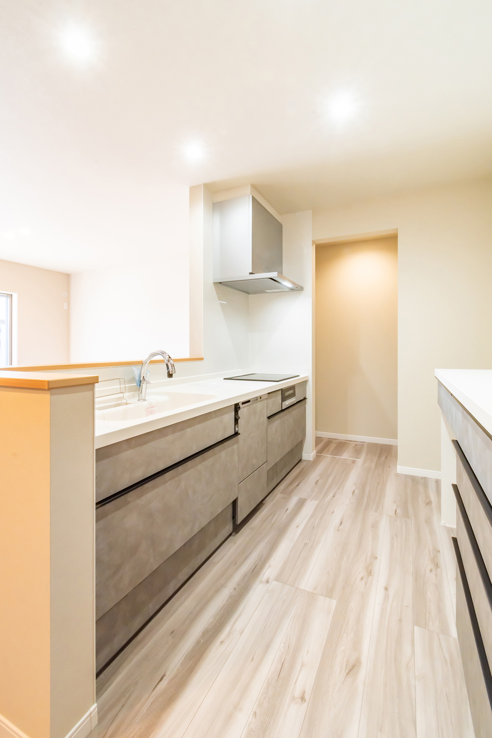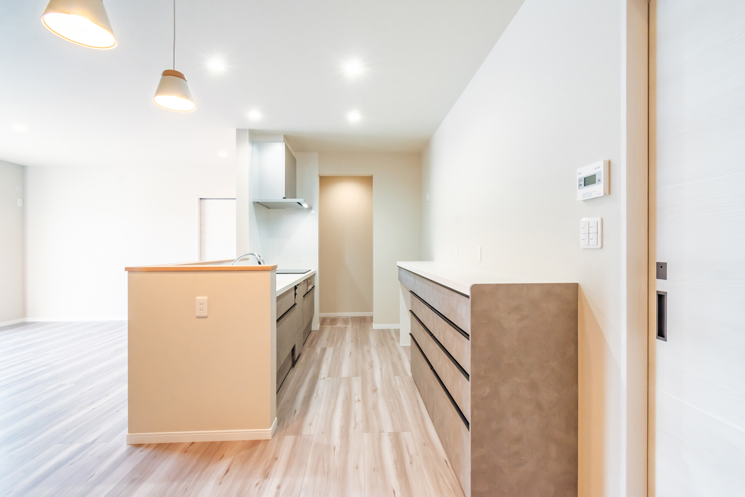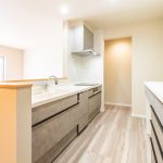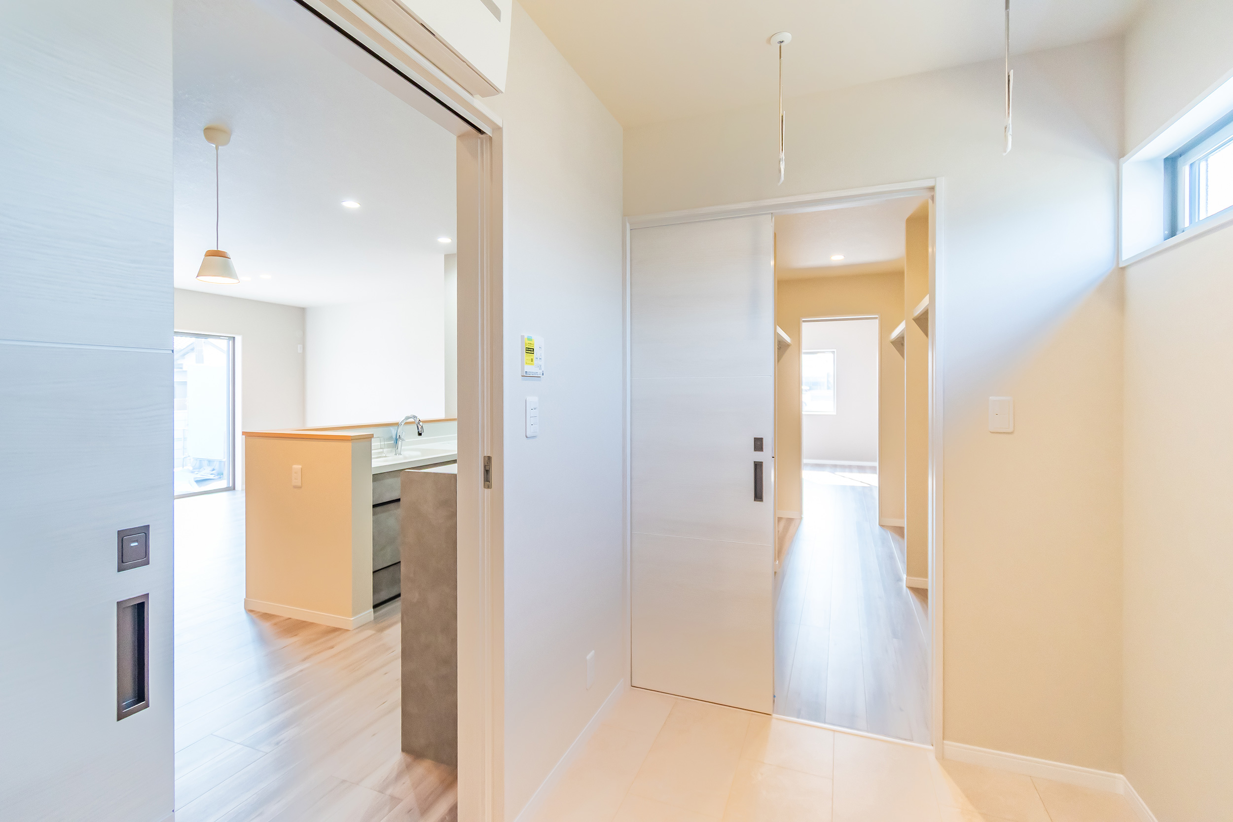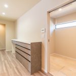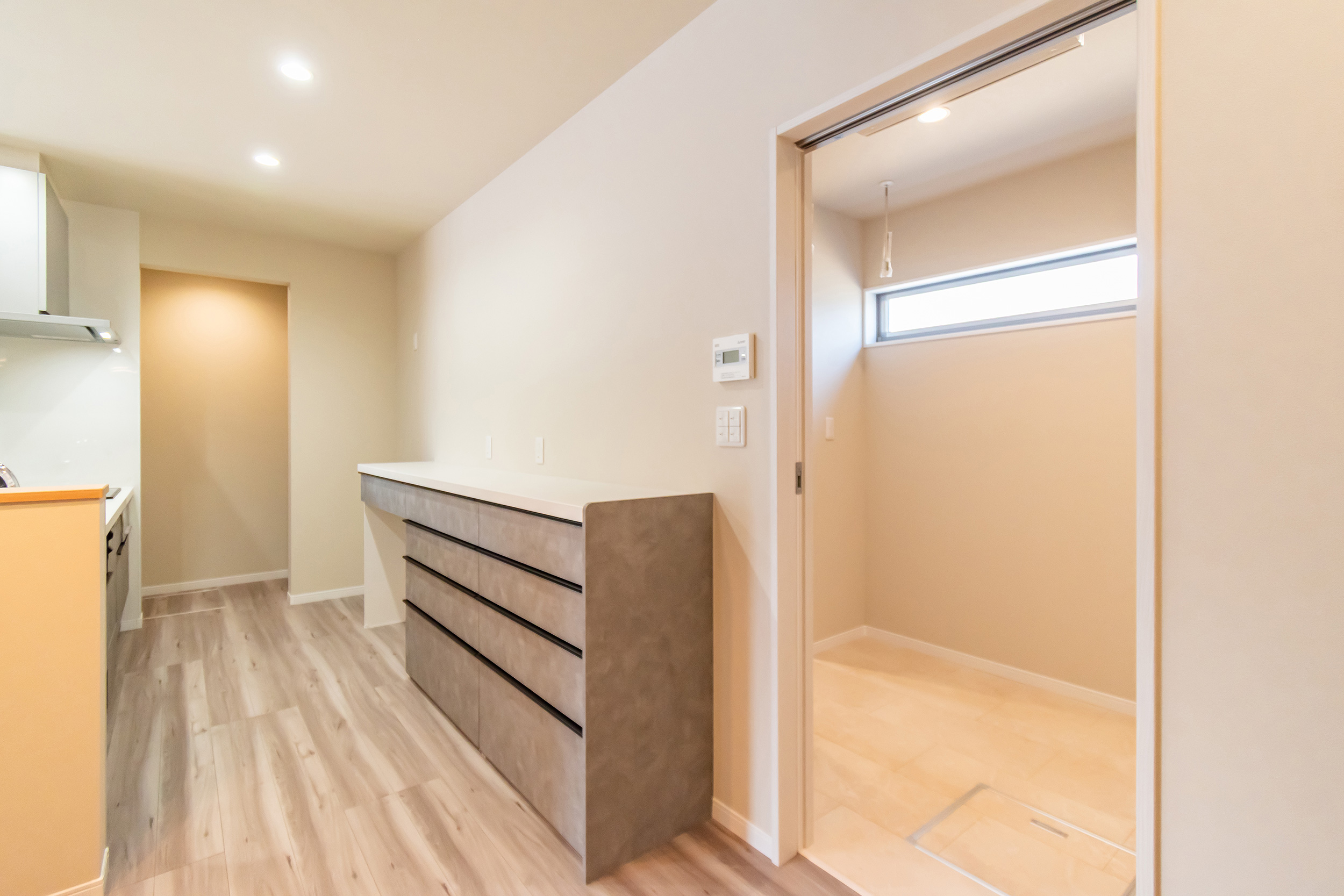 広々としたLDKは南向きの大きな窓から自然光が差し込み、開放感と上質な心地よさを演出します。キッチン横には収納力抜群のパントリー、ランドリールーム、そしてファミリークロークを配置。毎日の暮らしを効率的に、そして美しく整える間取りです。