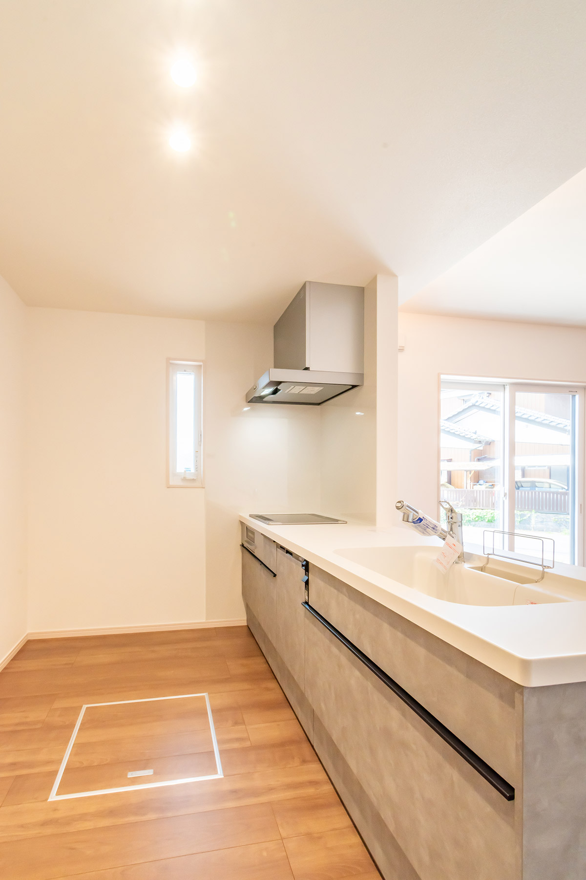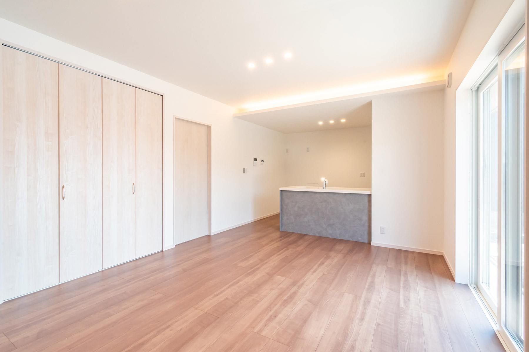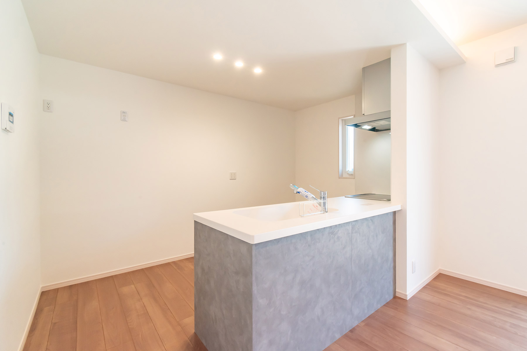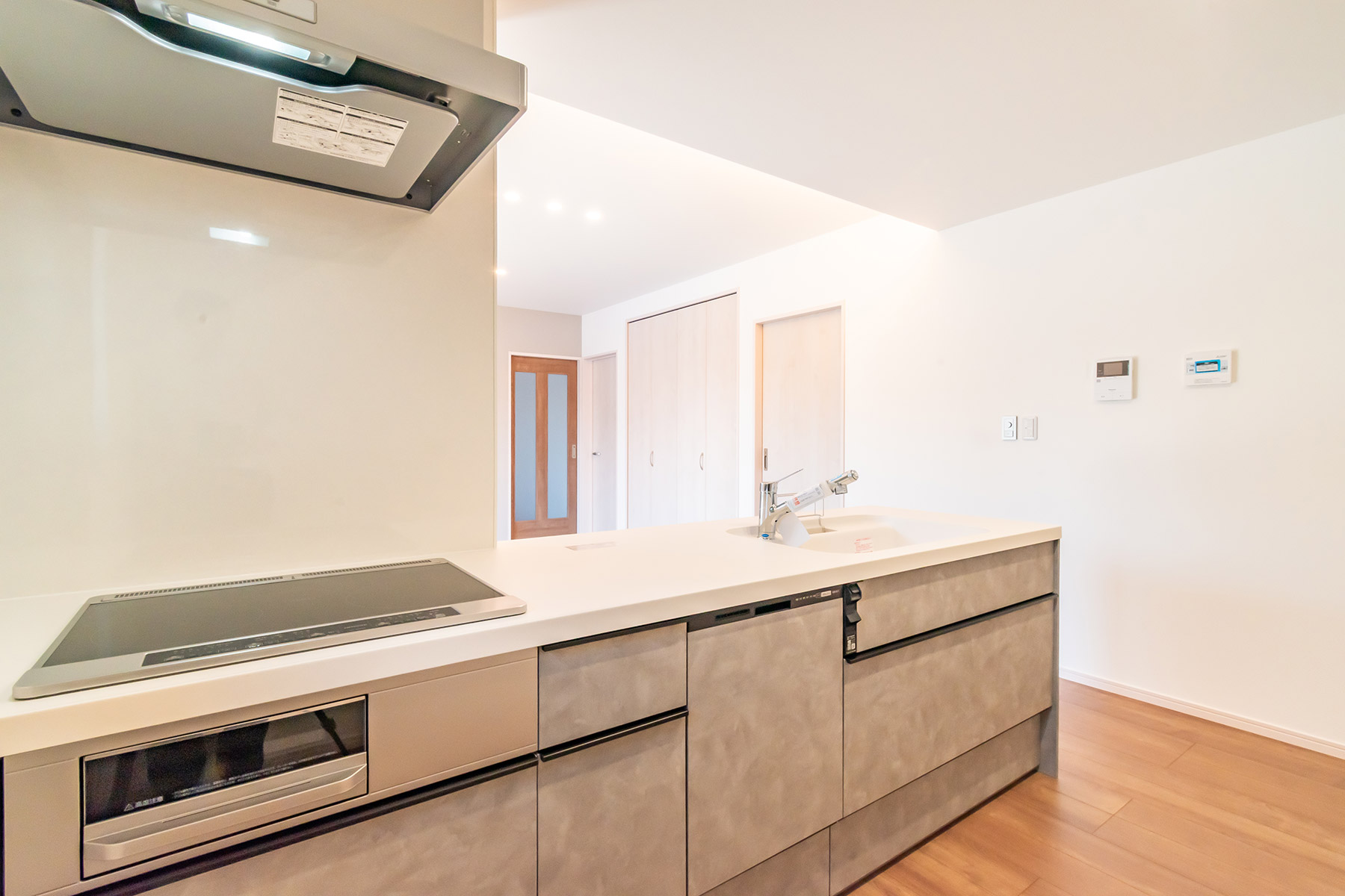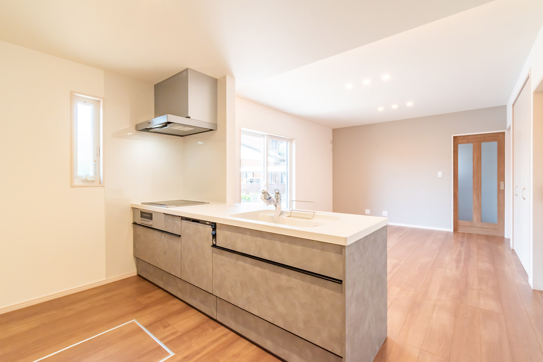 キッチンはおしゃれな下がり天井デザインで、空間に立体感を演出。