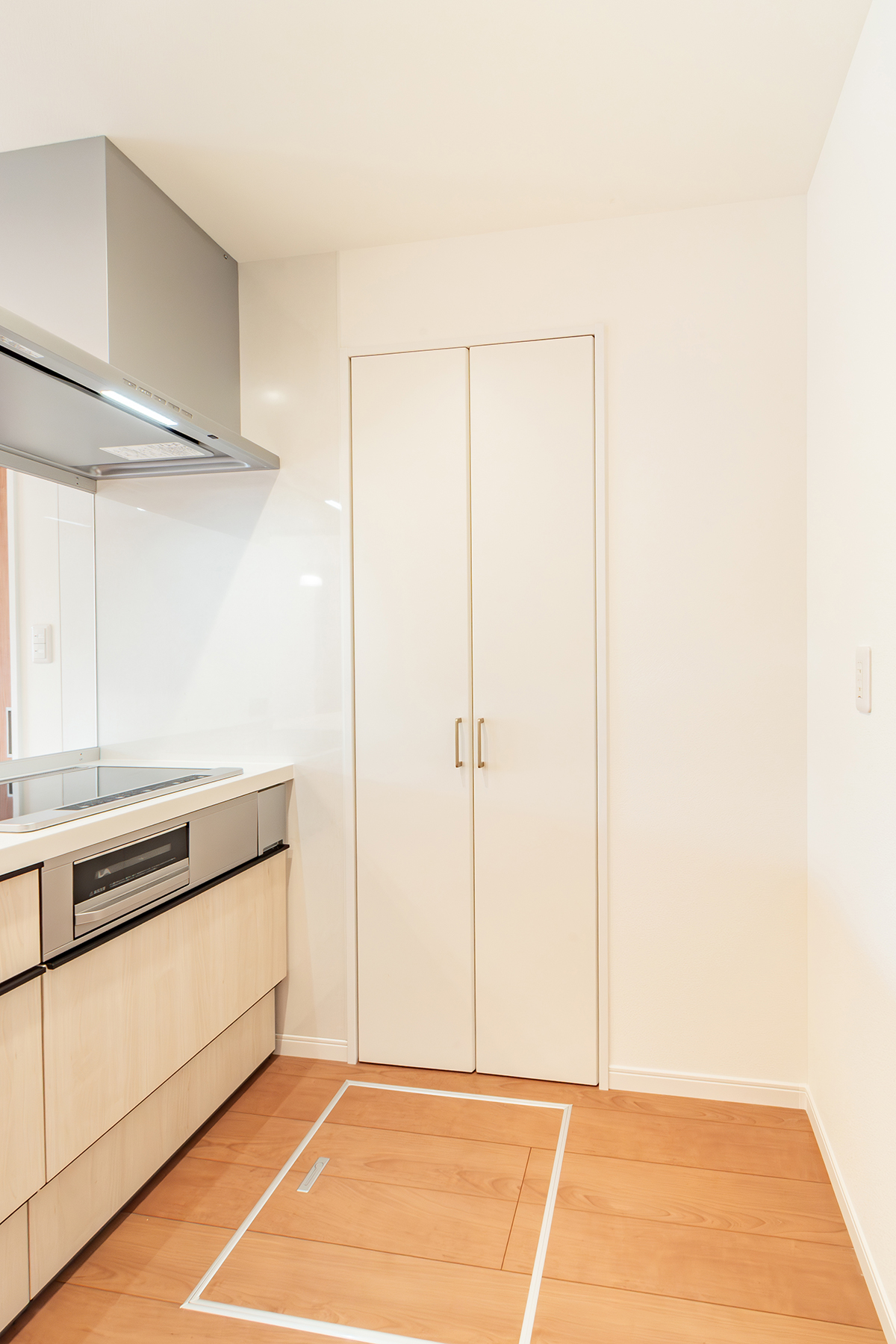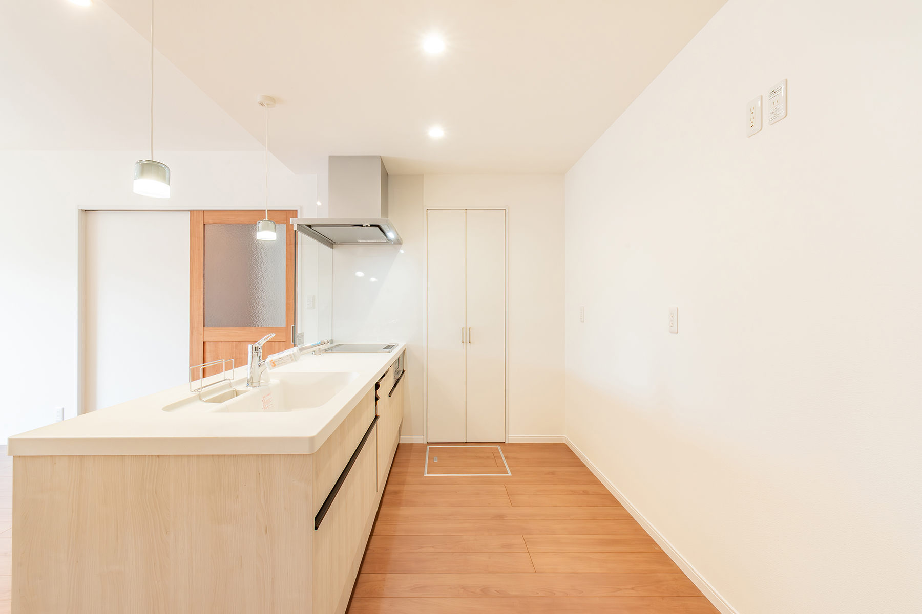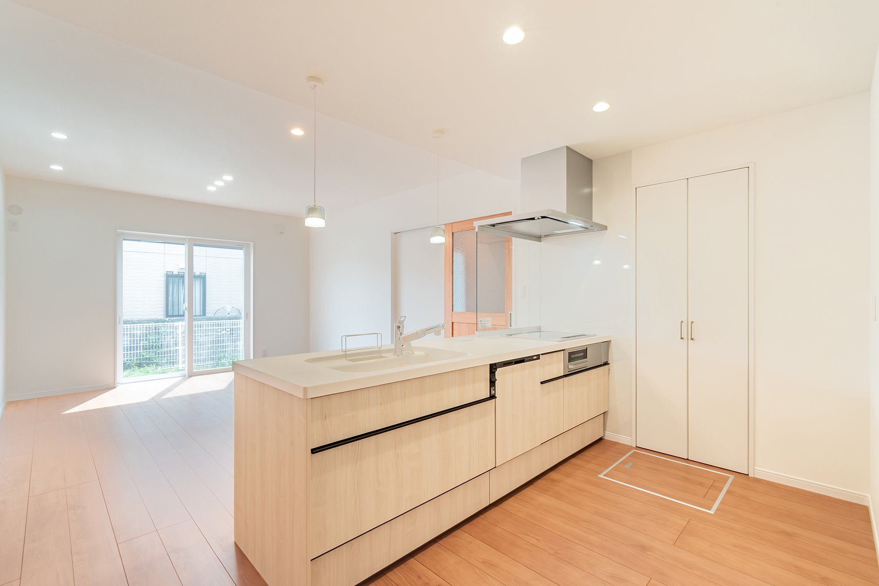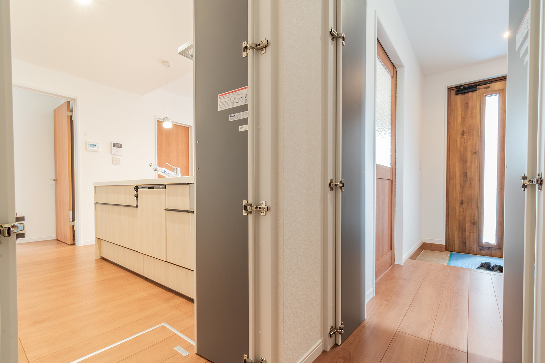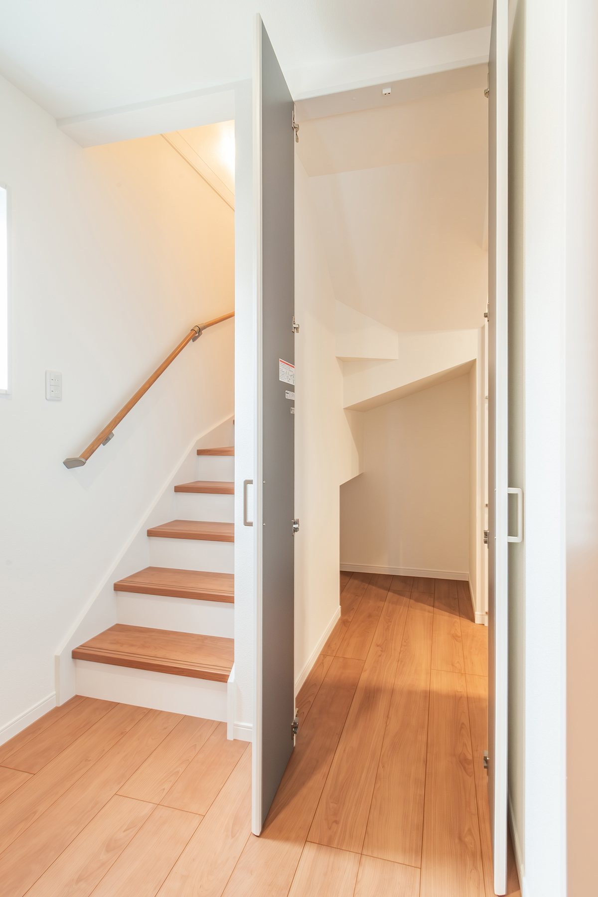 キッチン横から使える階段下収納や、玄関・各部屋のクローゼットなど、生活動線に沿った収納設計で片づけもラクに。