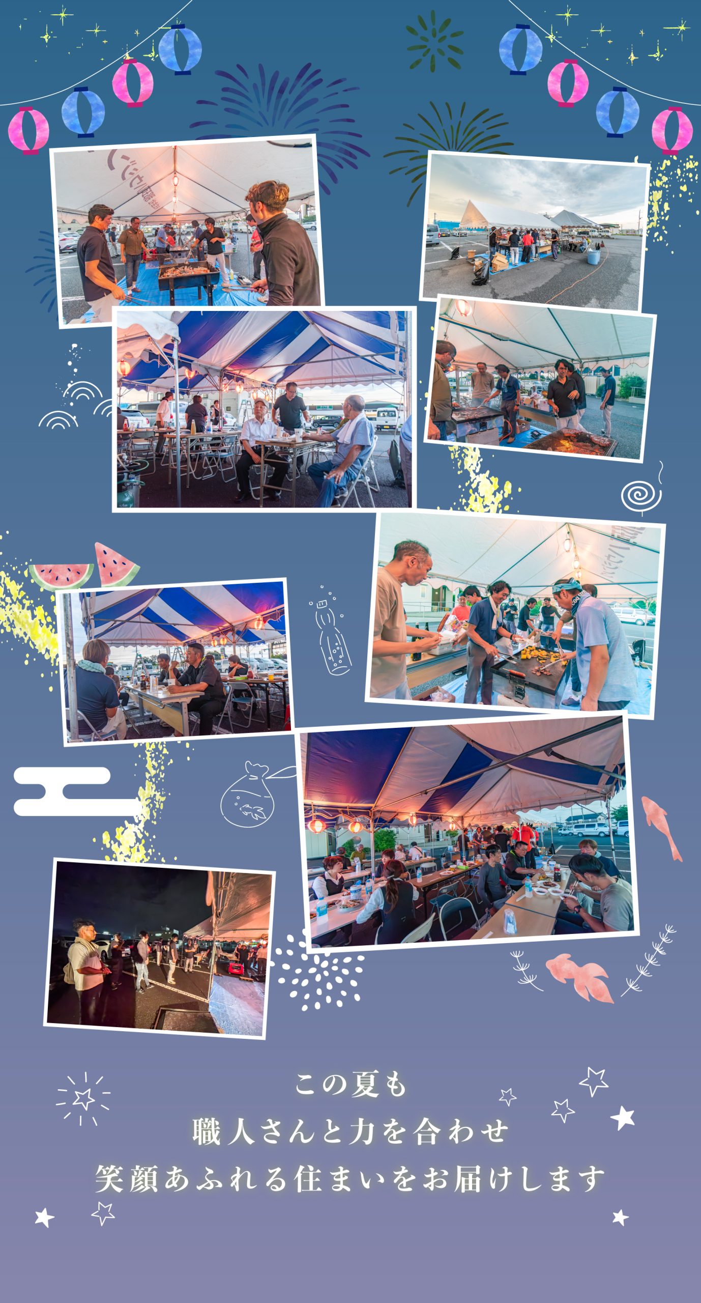2025.08.09 納涼祭を開催しました! 2025年8月8日、昨年に引き続き、弊社敷地内にて納涼祭を開催しました!日頃お世話になっている協力業者の皆さま、社員一同が集い、活気と笑顔に包まれたひとときに。途中には思いがけない自然のサプライズもありましたが、かえって会場が一体となり、より思い出深い時間となりました。これからも、職人さんと力を合わせ、暑さに負けず心あたたまる家づくりをお届けしてまいります。