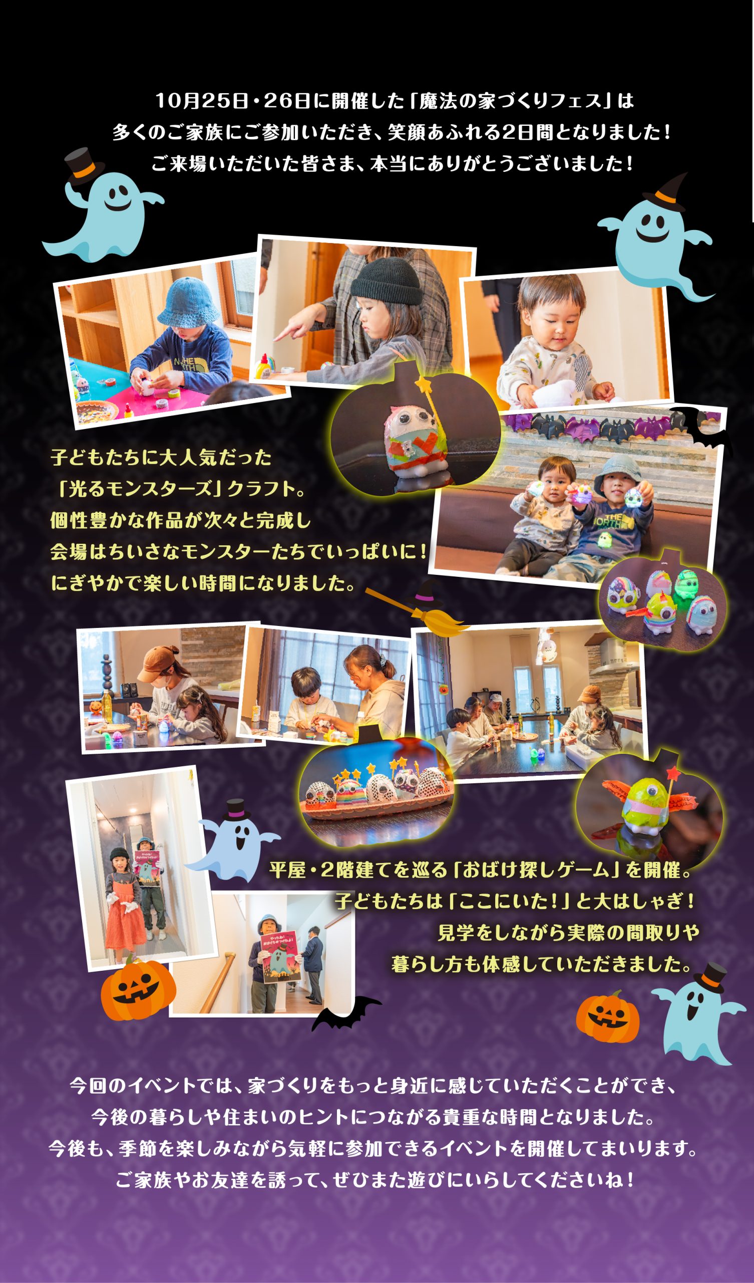 2025.10.29 ハロウィン家づくりフェス 開催レポート たくさんの笑顔をありがとうございました! 10月25日・26日に開催した「魔法の家づくりフェス」には、たくさんのご家族がご来場くださいました。クラフトやおばけ探し、間取りセミナーなど、笑顔と発見のつまった2日間となりました。ご参加いただいた皆さま、本当にありがとうございました!